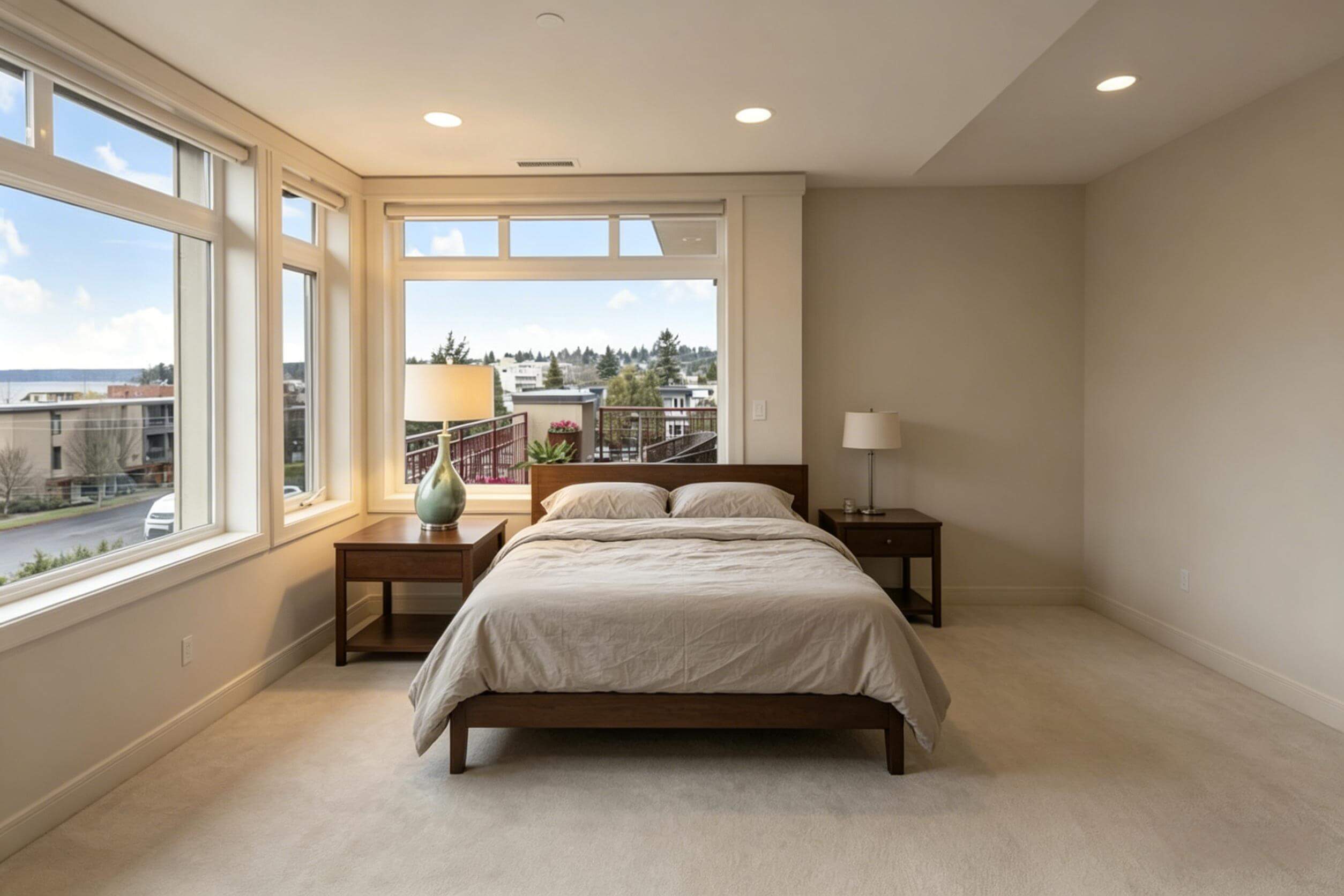 A calm minimalist bedroom concept with warm neutrals and a more intentional furniture layout.