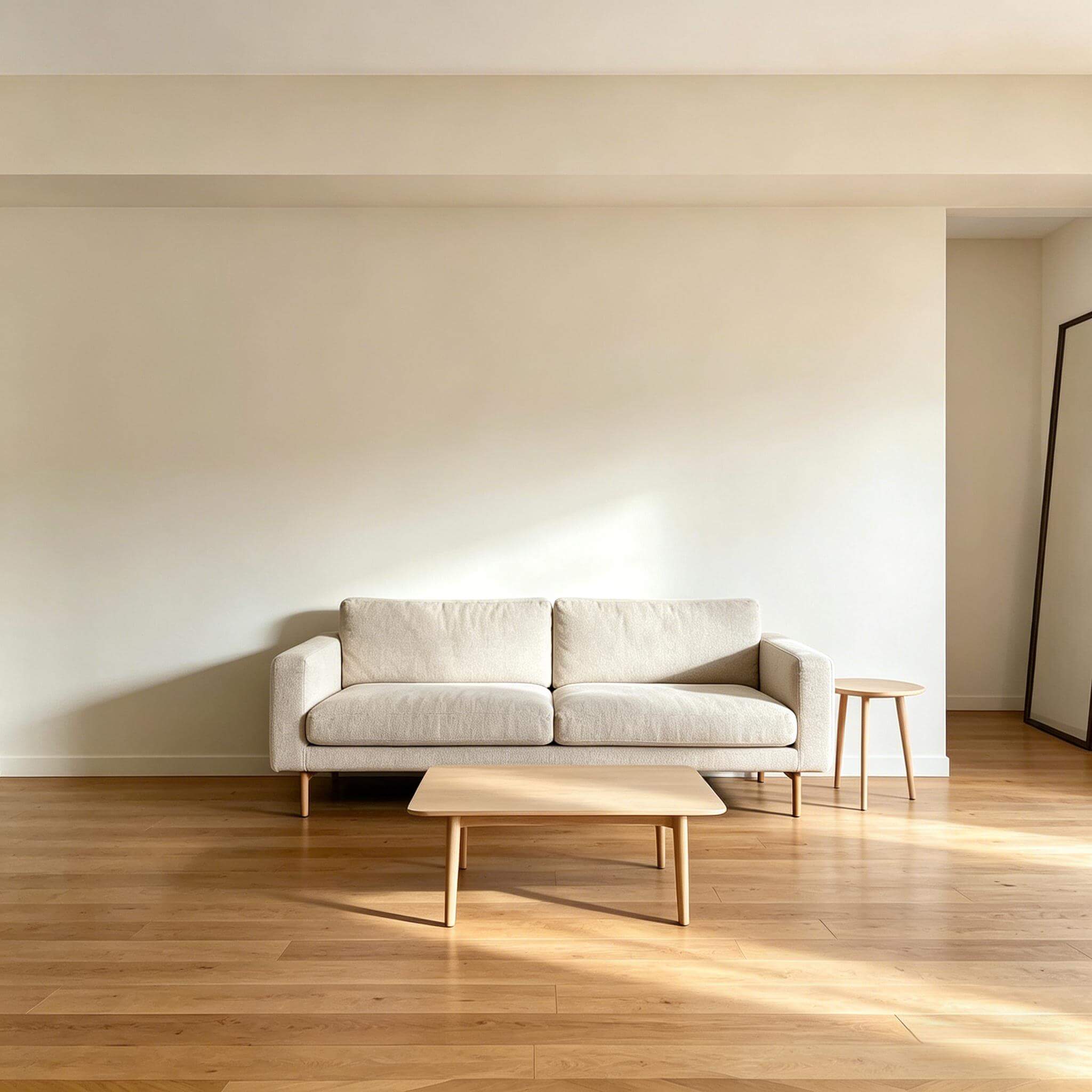 A calm minimalist bedroom concept with warm neutrals and a more intentional furniture layout.